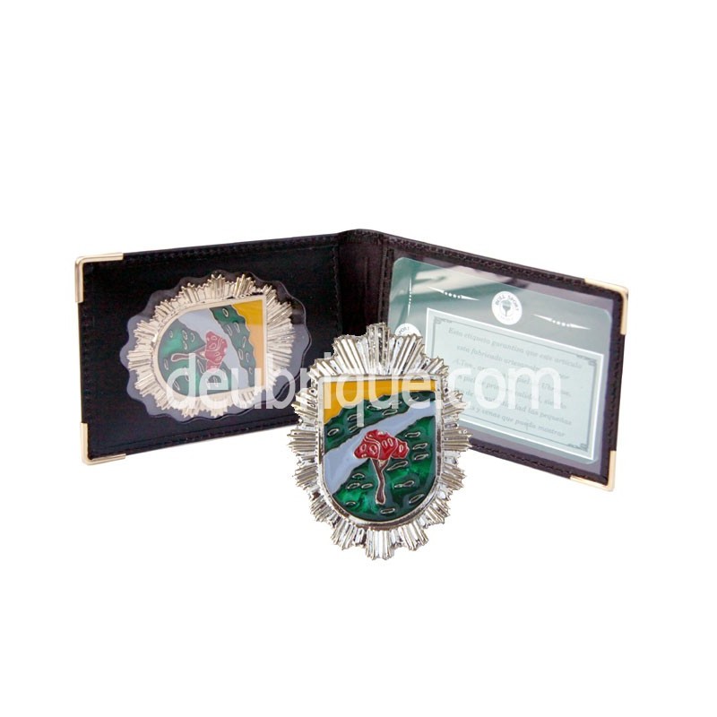 Cartera porta placas plegable, de dos cuerpos, con la placa de Guarda de campo, se fabrican para los distintos cuerpos policiales, policia nacional, local, municipal, mossos, guardia civil, ertzainza, vigilantes, escoltas, etc. reforzadas en las esquinas con cantoneras.