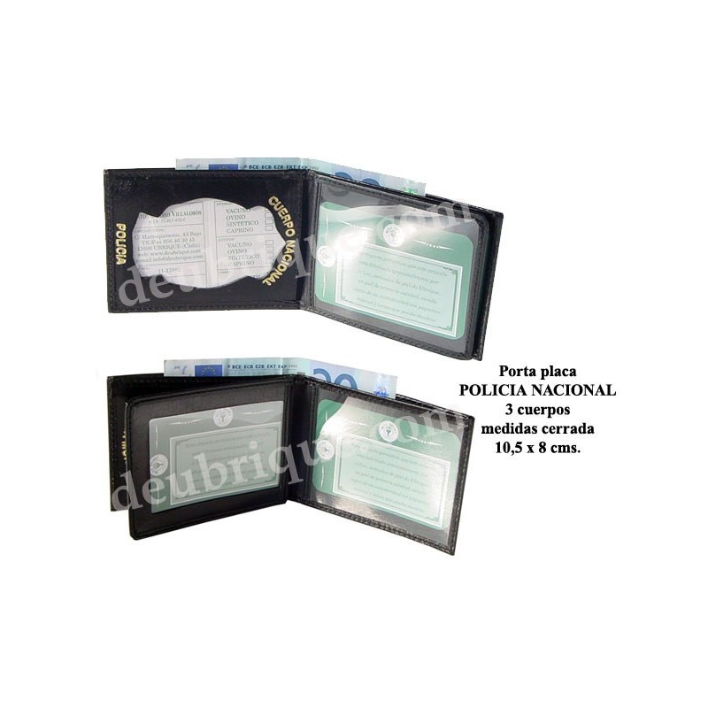 Cartera billetera para policia nacional. CNP, de tres cuerpos, realizada en piel, dispone de departamentos para identificación policial y privada, asi como hueco para la placa insignia.
